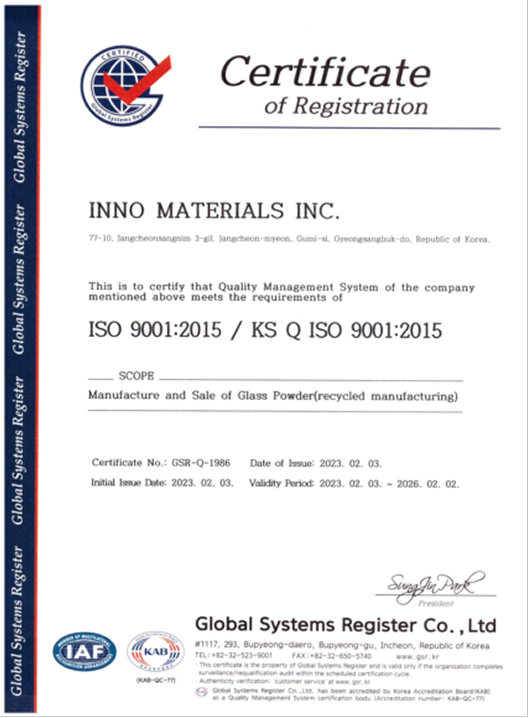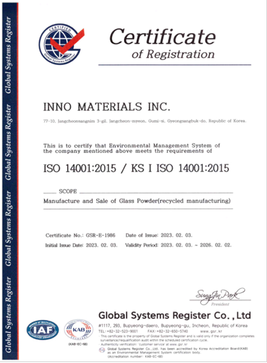 INNO MATERIALS is a recycling company that collects industrial wastes and applies accumulated technical competence to produce raw materials for industrial materials with high added value. INNO MATERIALS aims to develop and supply eco-friendly materials for coexistence of humanity and nature. INNO MATERIALS promises to leverage its ESG management based on circular resource economy vitalization to maximize values of recycled raw material and realize sustainability as a leading company. Based on differentiated technology, competence, hardworking and credibility, INNO MATERIALS sets three customer value goals “Lowest Price”, “Highest Quality” and “On-Time Delivery” to grow with our customers as the “World Best Company” in the eco-friendly recycled raw industrial material field. Thank you. CEO Park In-ro